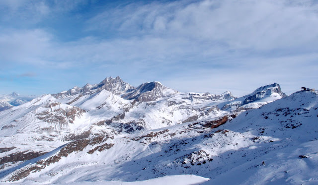 走上平台後,再上去觀景位置的話要走一段斜坡,因為真的斜加上雪地很滑,要拉著輔助的繩上升,用了五分鐘才上到觀景台。圖中那個圓頂建築是Kulmhotel,位於歐洲最高3100米的酒店,這裡又佩服起來了,建纜車本身已經夠厲害,這裡甚至連酒店也有。不過,同時又覺得因為人們對馬特洪峰的喜愛,就這麼犧牲了對面的這座雪山,有點可憐。